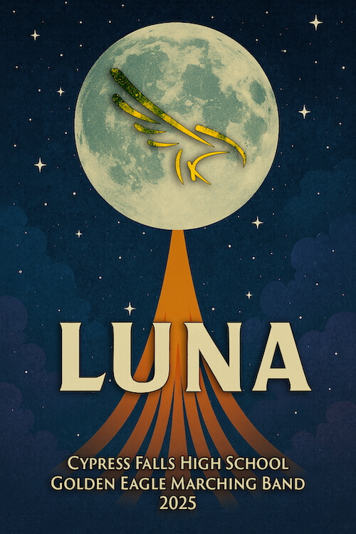 Show Shirt for the 2025 Cypress Falls Golden Eagle Marching Band. The shirt includes all student’s names listed on the back.
